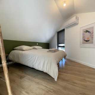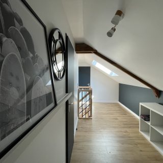 Au rez-de-chaussée, nous retrouvons une cuisine ouverte sur un grand séjour, une suite parentale trouve sa place côté rue. À l’étage, la modification de la charpente et la création d’un escalier ont permis l’aménagement de deux chambres sous rampants et d’une salle de bain très fonctionnelle.