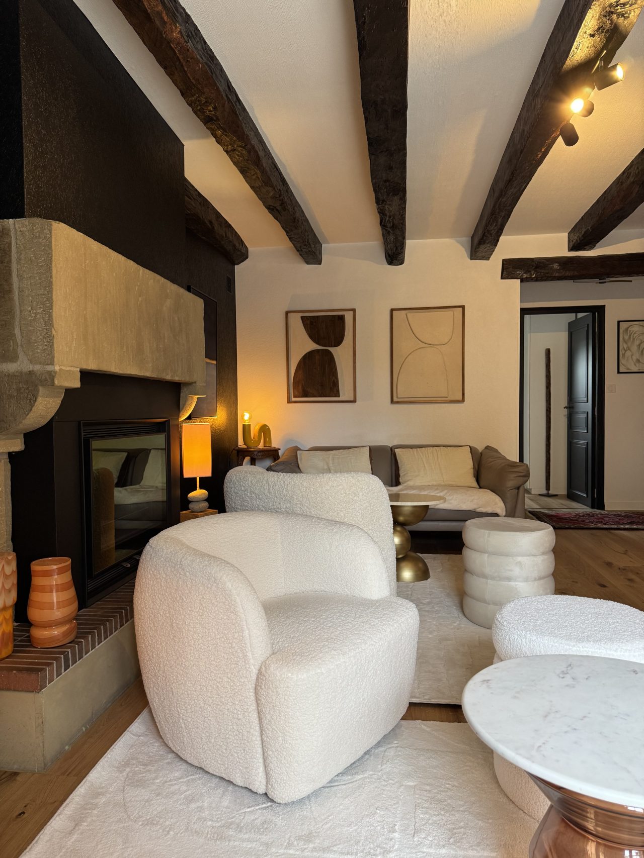 Résultat : un intérieur chaleureux et contemporain, où poutres anciennes et matériaux modernes se répondent harmonieusement.